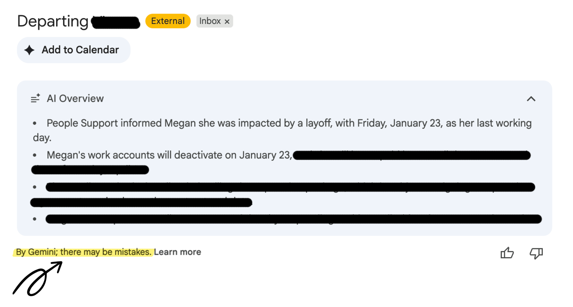 Last week I got laid off. I’d known it was coming for a while so, while it’s sad, I was ready and I’m genuinely excited for whatever’s next. The layoff isn’t what this post is about, though. It’s about the AI Overview that appeared at the top of the layoff email I received—and, more specifically, the disclaimer below it: